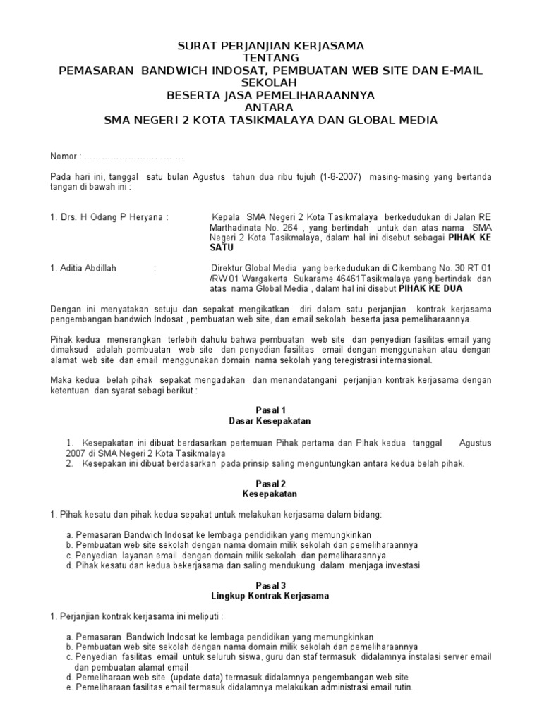 Surat perjanjian kerjasama para pihak yang bertanda tangan di bawah ini: 5.2 kerjasama yang dijalin antara dua belah pihak dapat terus dilakukan sepanjang kontrak kerjasama (m ou) masih berlaku dan apabila berakhir dapat diperpanjang jika kedua belah pihak menghendakinya. Perjanjian kerjasama ini berlaku untuk jangka waktu 2 (dua) tahun, terhitung mulai tanggal 2 desember 2018 sampai dengan tanggal 2 desember 2020. Pentingnya kontrak kerjasama untuk mengembangkan usaha anda posted on 09 oktober 2020 · by kontrak hukum sebagai makhluk sosial, kita tidak dapat hidup sendiri dan memerlukan bantuan orang lain untuk memenuhi kebutuhan hidup. Melalui kerjasama tersebut, pebisnis dapat memperoleh keuntungan lebih besar.
